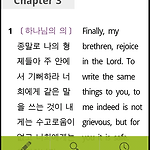 최근 업데이트가 좀 많았죠?오늘 또 약간의 업데이트를 하게 되었습니다. ^^ 2.1.0 버전 개선 사항 절간격 조절 기능 추가절 단위 보기, 세로 역본대조 보기, 가로 역본대조 보기 에서 절과 절 사이의 간격을 지정해주는 기능입니다. 한 화면에 절 하나씩만 보고 싶은 분들에게 필요한 기능입니다.기본값은 10인데 한 100정도 단위로 늘려가시면 간격이 벌어지는게 보이실겁니다^^ 색상 테마 기능 추가색상을 하나하나 지정하기 힘드시다는 의견이 있으셔서 추가된 기능입니다. 화이트/블랙/사용자 정의로 구성되어 있습니다.기본적으로는 사용자정의로 되어 있는데, 화이트나 블랙을 선택하면 쉽게 밝은 배경과 어두운 배경으로 설정가능합니다. ^^ 블랙 테마의 경우 하이라이팅 색상 중에 추천하실만한 색상 있으시면 꼭 말씀해주..